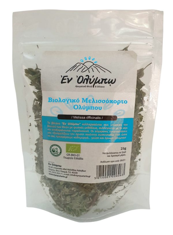 Το βιολογικό Μελισσόχορτο «Εν Ολύμπω» καλλιεργείται στις παρυφές του βουνού των Θεών με φυσικές μεθόδους, συλλέγεται με το χέρι και αποξηραίνεται παραδοσιακά.